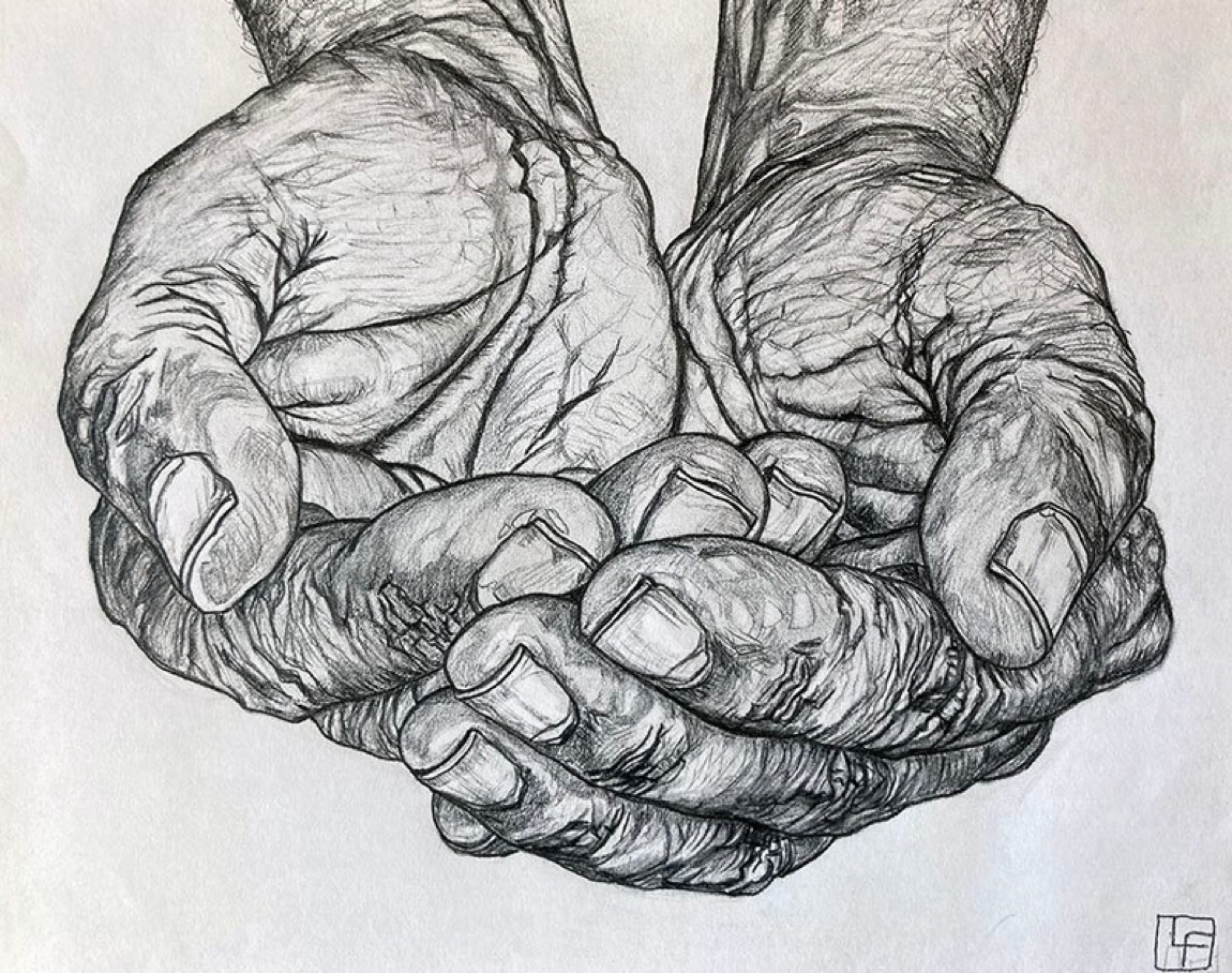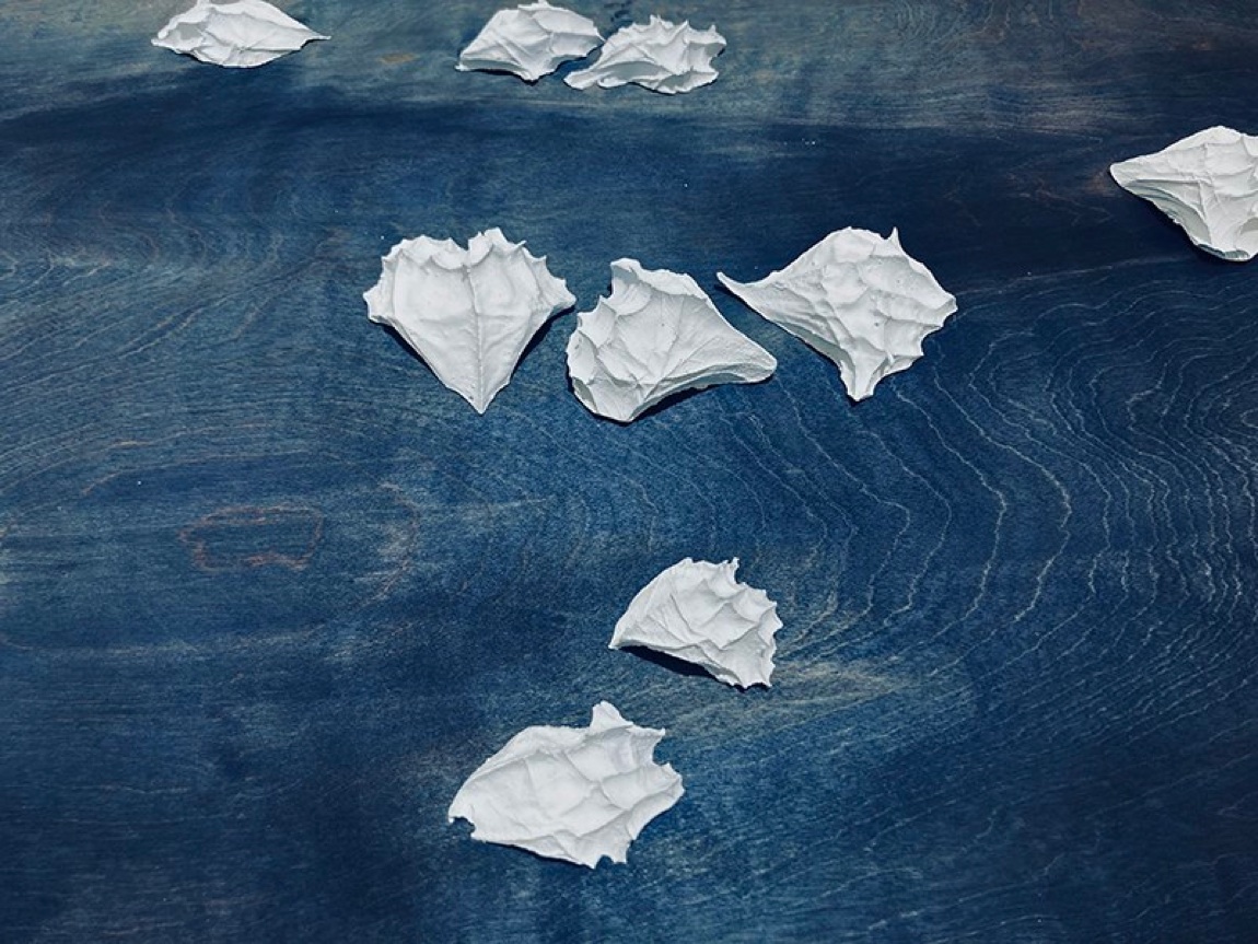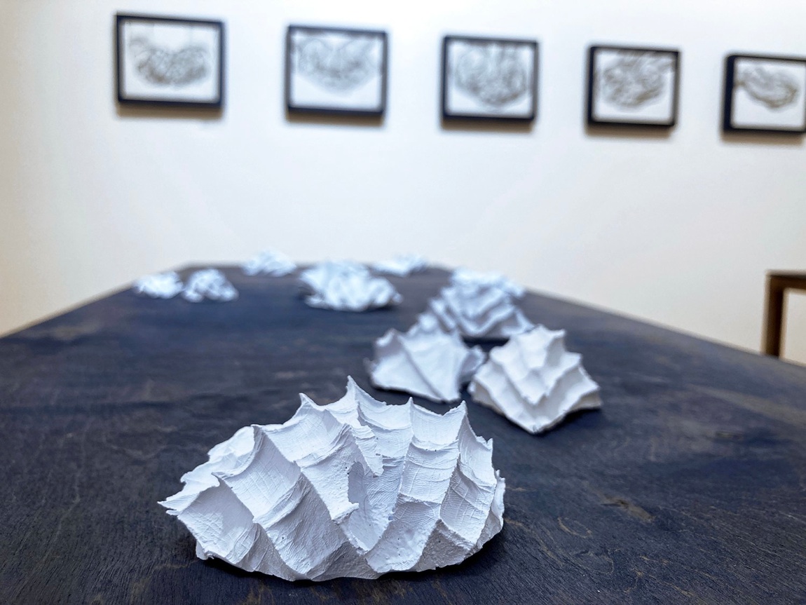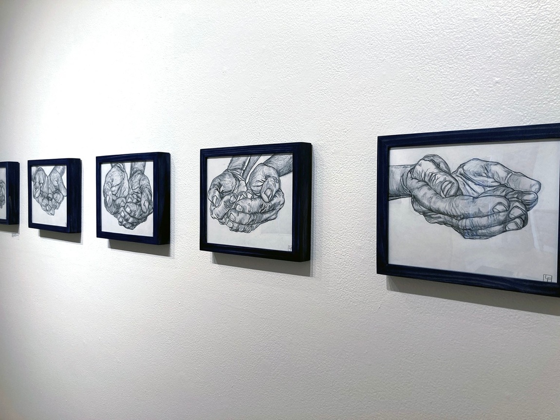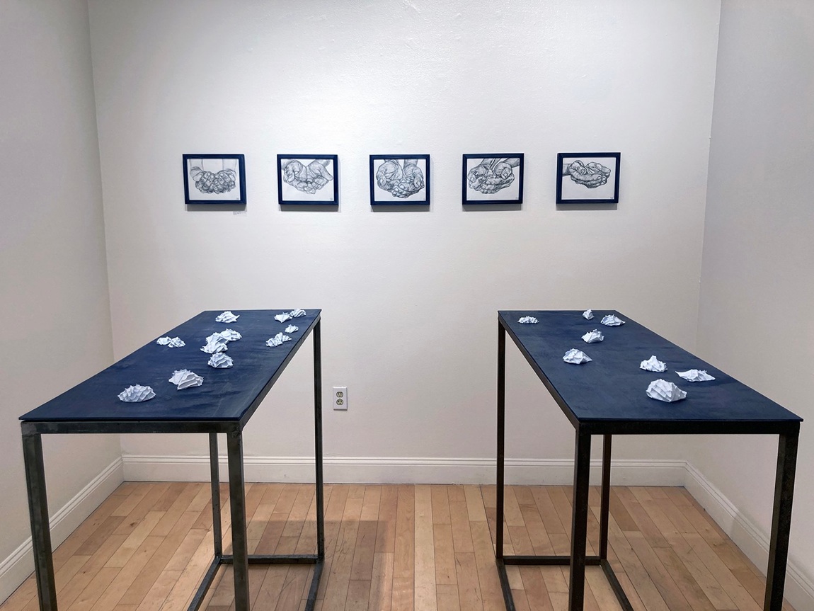 “Crevasses and Crevices”, Installation, Charcoal Drawings and Casts of the negative space of cupped hands on stained birch plywood, Dimensions Variable, 2021