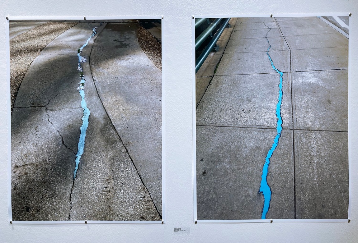 “Bodies of Water #6”, Archival Digital Prints, Diptych, 32"H x 24"W each, 2021. Documentation of public intervention for which I filled sidewalk cracks with blue cement. The filled cracks appear as miniature rivers within the larger landscape of Providence.