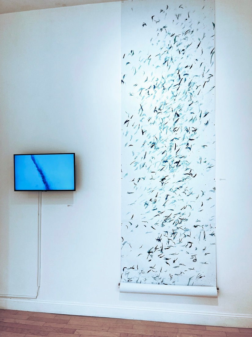 Performance residue made by casting with a fly rod and a fly dipped in ink before each cast.