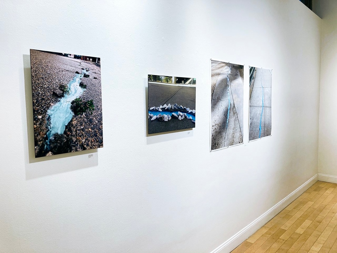 “Bodies of Water #2, #1 & #6”, Archival Digital Prints, 2021. Documentation of public intervention for which I filled sidewalk cracks with blue cement. The filled cracks appear as miniature rivers within the larger landscape of Providence.