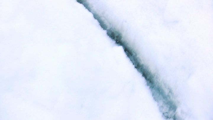 Mock footage of a helicopter flying over a glacial landscape in a search and rescue mission. Part of the “Bodies Of Water” series for which I filled sidewalk cracks with blue cement. The filled cracks appear as miniature rivers within the larger urban landscape.
