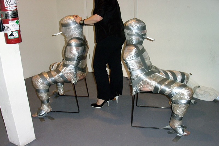 We contracted with a professional Dominatrix (Mistress Morgana) to ‘mummify’ us, as the audience and three surveillance cameras watched on. Following the advice of the United States Government, we used Saran Wrap and Duct Tape to “Shelter In Place”. The final step of the process consisted of holes being cut in the Saran Wrap to reveal our genital areas. Crumpled up paper had been inserted to protect the skin from scissor injury. Instead of newspaper, which is typically used, the protective pages were copies of the United States Constitution.