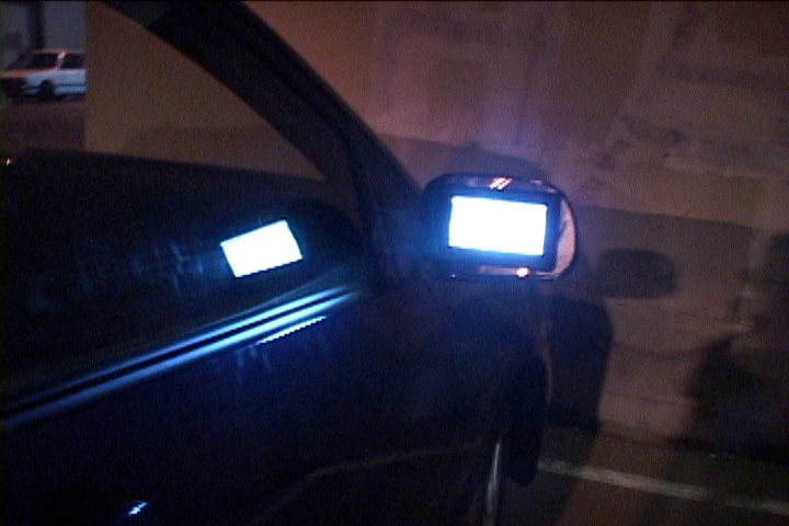 Alpha Bravo Charlie, 2007, 3:31 min, single-channel video of collaboration with Pam Martin performed for Close Calls, Headlands Center for the Arts. We transformed an ordinary Toyota family van into an SUV (SURVEILLANCE UTILITY VEHICLE) in order to conduct observation missions from parked locations at night. The primary feature of the SUV was the CCTV monitor system embedded in the side view mirrors. These monitors transmitted through live-feed, the surveillance operations occurring inside of the vehicle.