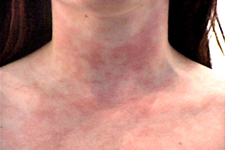 Documentation of a 20-minute performance during which I sat with a camera trained on my chest and neck, and live-feeding to a monitor. I slowly broke out in hives as a result of the nervousness of being watched.