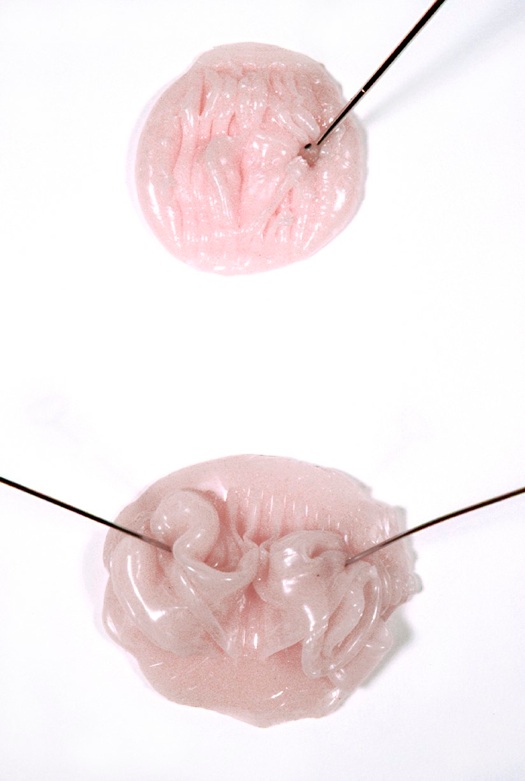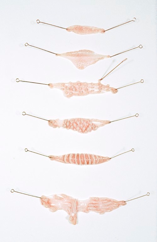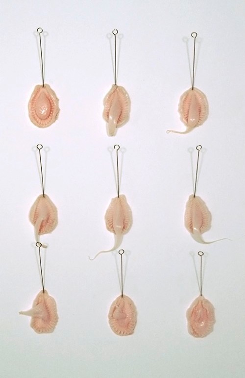By squeezing polymelt through ordinary kitchen utensils (strainers, cheese cutters, wisks etc), I created a strangely sexual taxonomy of objects and displayed them pinned to the walls as if part of a Victorian medical lab of “female abnormalities”