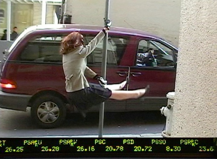 Dressed in a business suit, I performed “striptease” pole tricks almost directly underneath the Charles Schwab marquee that continually flashes the “market news”.