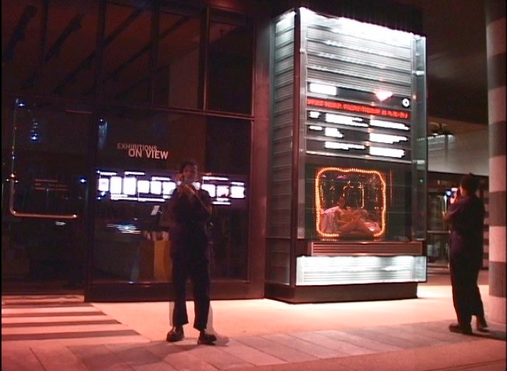 Video Proposal for Olympia: Sex Worker at the SFMOMA, 2007, 4:51 min, single-channel video of me as voyeur, documenting the video of me "working" in a peepshow window, which has been composited onto the SFMOMA box office window