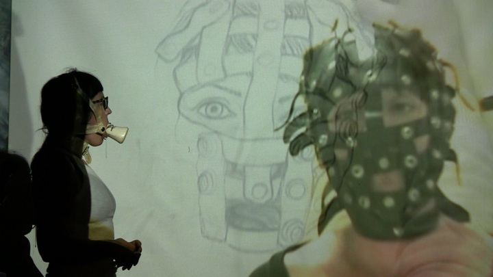 Documentation of a lecture at the Community College of Rhode Island & AS220. While wearing a bit fashioned out of hog gut and bone that is also a whistle, I tried to give a lecture about my work.